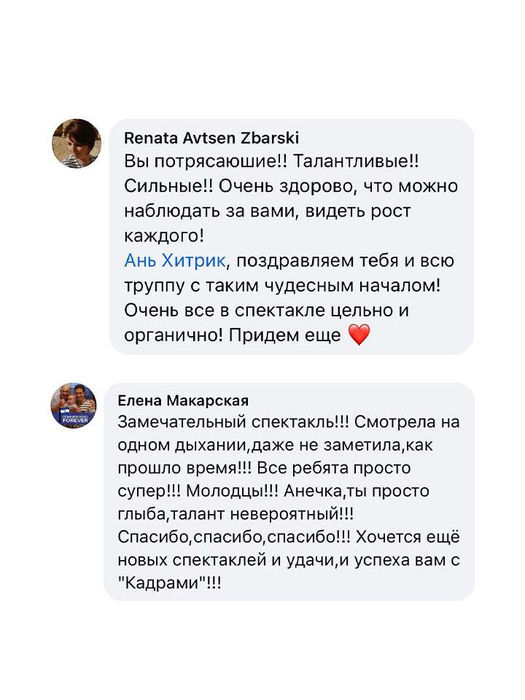 אן חיטריק — בוגרת האקדמיה הממלכתית לאמנויות של בלארוס, שחקנית ורֵז’יסרית ראשית לשעבר של התיאטרון האקדמי הלאומי ע״ש יאנקה קופאלה (מינסק).